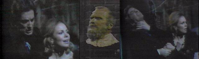 The camera pans to a horrified expression on Bramwell's face, then Barnabas' portrait (didn't Julia give that to Bramwell as a wedding present?) As the familiar DARK SHADOWS theme music swells, Thayer David narrates: "There was no vampire loose on he great estate. For the first time, the bites on the neck were indeed those of an animal. Melanie soon recovered and went to live in Boston with her beloved Kendrick. There they prospered and had three children. Bramwell and Catherine were soon married, and at Flora's insistence, stayed on at Collinwood, where Bramwell assumed control of the Collins business interests. Their love became a living legend, and as long as they lived, the dark shadows at Collinwood were but a memory of the distant past.