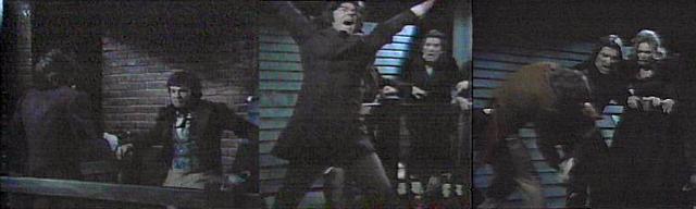 Morgan drags the struggling, hysterical Catherine out on the parapet. He drags her to the railing. Cruelly, he says, "Admire the view, Catherine." "Please," she begs. "What?" he asks--"Let you be with your lover? Even I'm not that generous. He will find us here, Catherine, I'm going to help him find us!" He opens the door--Bramwell! he screams. Don't come up! Catherine shrieks out. Morgan grips Catherine and tries to force her to look down. "Imagine yourself falling, falling down, down, hearing yourself SCREAM all the way down until you hit the bottom and the hard ground below! Listen, Catherine, your lover is coming, you can't stop him now." Bramwell, don't come up! yells Catherine. He does, naturally, and screams, "NO!" when he realizes what Morgan has planned for his lover and child. "Bramwell, you have come to see Catherine die!" Morgan cries, and starts to force Catherine over the railing.
