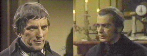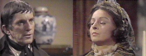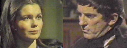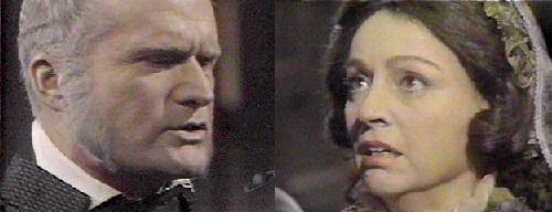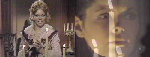 Barnabas, puzzled at seeing his bride using candlelight during the day, asks Angelique why she lit them as she snuffs out her spell-binding candles. Oh, she was crawling around on her hands and knees in a most unladylike posture, searching for the brooch Naomi gave her--so she had to light the candles to find it. It was a gift from the mother of her loving husband, she says softly, caressing his face, but then Sarah, calling, "Miss Winters!" walks into the Old House followed closely behind by Joshua and Abigail. Angelique does her best to play hostess, but she is ignored, and Joshua glares at Barnabas as he asks permission to come into his house. (Poor guy is just trying to show his father that he's an adult, a bridegroom, but Joshua just won't bend.) Abigail demands that Sarah explain how she heard her governess' disembodied voice, but Barnabas calls the whole situation absurd and insists Vicki isn't there. Abigail asks his permission to search the house, anyway. No, says, Barnabas, Miss Winters is a poor, frightened, hunted girl (and he flat out says he wouldn't tell them she was there even if she was). Abigail warns Barnabas that all of them are in danger from the witch, but especially Sarah, who Miss Winters called to.