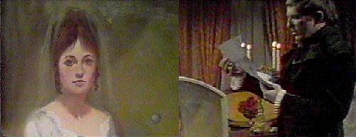 The huge package, once unwrapped, turns out to be Josette's portrait, intended as a gift for Barnabas from Miss duPres. Barnabas gazes sadly at it, then opens the accompanying letter, which says she told her father Barnabas didn't need this portrait; he'd have the real thing! Barnabas crumples the note with anger and sorrow and tosses it into the fireplace. Angelique, in a fetching blue nightgown, enter and observes the way he's looking at the portrait. She comments that isn't a wedding gift for THEM and wants to put it in the attic, but Barn says he'll offer it to Andre. She can't understand why he's looking at that portrait the way he is, has he forgotten what Josette did to him? What was that? demands Barnabas. She fell in love with Jeremiah, answers Angelique, as if to a child. Did she?--or was she under a spell? counters Barnabas. Ang isn't happy he's being so kind to his former fiancee; a month ago he called Josette fickle and callous. I have a right to change my mind, he says. Angelique, shouting, accuses him of still being in love with Josette, then immediately reins in her temper. I love you, and I'm jealous, she admits, sorry. Angelique, what is love to you? he asks softly. You know what I think it is, she responds. "Do you?" he counters.