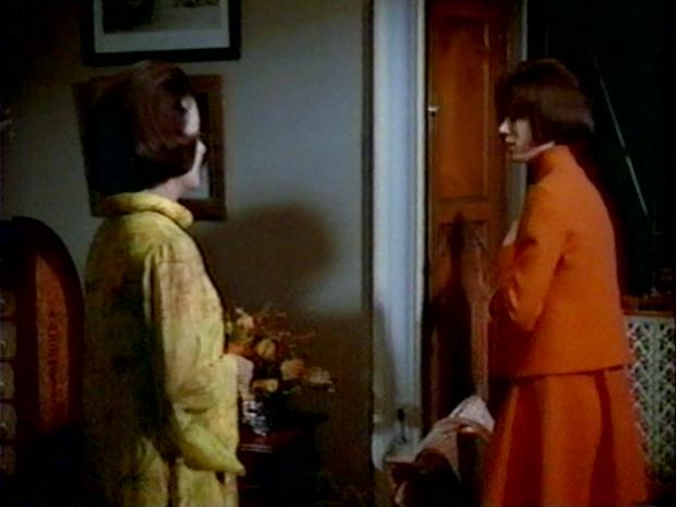 There's RT/OS Carolyn, right below is a young woman, I think wearing a suit (jacket with skirt), she has short hair, but for some reason, I'm thinking it's a wig.....who is it and in what story is she from?
