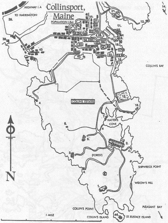 2. The section of coastline depicted on the map is an actual piece of Maine real estate. I chose this peninsula because I felt Collinwood should be large and isolated at the same time. By anyone's definition, private property fitting into a 4x1 mile rectangle is huge.
