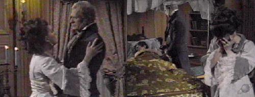 Naomi sits sadly by her son's bedside. He continues to rant about the bat. "Get it away!" he shouts. Joshua, walking like an old man, comes in and he and Naomi hug each other when she tells him their son is no better. She thinks Barnabas will fight harder if he knows his father is there. Joshua, his voice cracking, tells Barnabas how stupid he's been (sure, you say that NOW!)--he had the right to marry whomever he wished. I want you to know. . ..Joshua, miserable, turns to Naomi and asks if there isn't anything they can do--a doctor from Bangor, perhaps? It would take too long, laments Naomi. In a heartbreaking scene, Barnabas recalls when he was a boy and saw his father brought in from being wounded in the war. He didn't recognize him and began to cry, but he knew his father would be angry to see his tears. Barnabas promised himself then that if his father survived, they'd live together peacefully. Joshua swears that WILL happen.