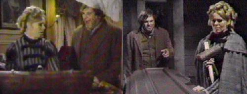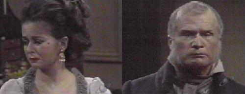 Later, Ben quietly enters the Old House and Joshua returns to find him there. He curtly tells Ben that Barnabas is dead and accuses him of coming to rob the body. He was my friend, protests Ben, then adds, touchingly, "If you had any love for your son, you'll let me grieve for him." Angelique, coming downstairs, agrees with Ben. Joshua orders her to stay out of it, but Ang insists Joshua must treat Ben as Barnabas would have wished. Joshua asks Ang if she's afraid of being alone with Ben, and she says of course not--they were servants together. Joshua curtly responds, in a delicious diss, "THAT I will NEVER forget!" He stalks out.