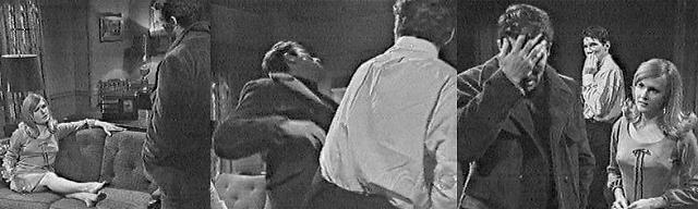Burke stands and asks what he wants. Is Carolyn in there? asks Joe. Burke looks down at her. Tell him yes, says Carolyn defiantly, and Burke grins. Carolyn takes her brandy glass and lies on the sofa. Burke goes to the door and opens it. Joe comes in and spots Carolyn on the sofa. He gazes at her reproachfully. Hello, Joe, she greets him--are you spying for my mother now?--how manly of you. I'm not spying on you, he says evenly, I don't care where you go or what you do--I'm only here because your mother is worried. Did she call you? asks Carolyn. That's right, says Joe--I think you'd better let me take you home. I'm not leaving until I want to leave, she says, drinking her brandy. When will that be, tomorrow morning? asks Joe. (Whoa, get her!) She kneels on the sofa. You have no right to talk to me that way! she says angrily. You'd better use your handkerchief, Mr. Devlin, Joe tells Burke, that shade of lipstick doesn't suit you. OK, says Burke, you made your little speech, you'd better get going now. All right, but Carolyn's coming with me, insists Joe. I'm not going anyplace, Carolyn informs him. You heard the lady, let's go, says Burke, taking Joe's arm. Joe pulls away. I said let's go, commands Burke, and Joe punches him in the face. Burke punches Joe back, first in the face, then in the stomach.