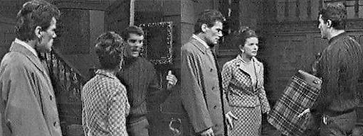 The phone rings at Collinwood. Liz answers. It's Frank, telling her Vicki never got there. Do you think I should phone the sheriff? Asks Liz--yes, I guess it's still possible Carolyn and Vicki are together...she hears the front door open and says someone's there, can she call him back? She hangs up. Liz comes into the foyer where Carolyn stands looking guilty and defiant. Then you were with him, says Liz, looking at Burke. that's right, I was, says Carolyn. What's this about Vicki? asks Burke. When did she disappear? asks Carolyn. Joe, asks Liz, what happened to your face?--were you in a fight? I lost my temper, admits Joe. Never mind about that, what's this about Vicki? asks Burke. What about her? asks Carolyn. I'll tell you later, Liz tells her daughter, I also have several other things to say to you later--in the meantime, just go to your room. I'm not a little girl, insists Carolyn, and I won't be ordered around like one! Please go to your room! says Liz. All right, agrees Carolyn, who bids only Burke good night and ignores Joe before gong upstairs. I'd like to talk to you, Liz tells Burke, and he agrees he wants to speak to her, too. Joe looks upstairs at his former girlfriend. Burke and Liz go into the drawing room. Joe, about to hang up his jacket, almost trips over Vicki's suitcase, but doesn't notice it. I'll make this short and to the point, Liz tells Burke in the drawing room--your quarrel with Roger has nothing to do with my daughter--please leave her alone. I'm not here to discuss Carolyn, says Burke brusquely, whatever the personal differences are between us, they are beside the point--I'm here to help you find Vicki. I don't need your help, she says. You need anybody's help you can get, says Burke--don't you realize that Matthew--Matthew! You think that Matthew...says Liz. Matthew is missing--Vicki is missing! points out Burke, and if there's any possible connection between the two, we've got to find Vicki before it's too late--let's please forget our personal differences--Haskell! He calls to Joe, come in here, I need you. What do you want? asks Joe. We're gonna search for Vicki, says Burke, I think she might be in danger. I'll do anything I can, says Joe. When was the last time you saw her? asks Burke. About four o'clock, says Liz, I paid her her salary and she said goodbye to me. Did you see her leave the house? asks Burke. No, but I know she left, says Liz. How do you know that? asks Burke. Because her suitcase is gone, replies Liz--it was in the hall when we were talking. What kind of suitcase was it? questions Joe. A weekend case, says Liz. What was the color? Asks Joe. Red plaid, Liz tells him, why? Because I noticed a suitcase like that in the foyer behind the door, says Joe just as I came in--I was hanging up my coat and I saw it.