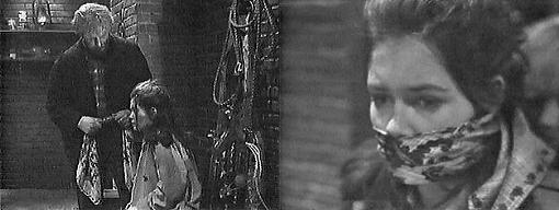Secret room - Vicki looks quite disheveled, sitting on the mattress. Thought you could outsmart me, didn't ya? chortles Matthew--thought you could trick me into trustin' ya so you could sneak out of here and sic the sheriff after me--too bad for you, I was onto your game all along. I did what you told me to, she protests--I gave you enough time to get away. Don't try to outsmart old Matthew, he's too shrewd for ya, brags the former handyman. You could have made a run for your car and no one would have stopped you, insists Vicki. Matthew sits down and lights a cigarette. When will you stop your lyin'? he demands. I'm not lying, she says--do you think the police are silent and invisible?--you know they're not outside--you were out there! Not right outside, maybe, says Matthew, but they could be in the woods, up by the ravine, on the cliffs. Pretty soon Mrs. Stoddard is going to find I'm missing, warns Vicki--the the police will start searching for me--and they'll look at this house. Let 'em search, says Matthew--they'll never find me here--nobody knows about this room but me, not even Mrs. Stoddard. How can you be sure Mrs. Stoddard doesn't know about it? asks Vicki. Because I am, he says. She knows everything about Collinwood and it's history, says Vicki--there's a very good chance she knows about this room--and a very good chance the police will trap you in here--unless you make a run for it now--you're going to lose your last chance to escape, and you know what I'm saying is the truth. He puts out his cigarette and reechoes for a length of rope hanging on he wall. What are you doing? asks Vicki, scared. Get up, orders Matthew. She shakes her head. Get up, he says again, and this time, she does. He pushes her into a chair and tells her he's tying her up, and gagging her--then he'll go outside and take a look--you could be tellin' me the truth. I AM, she says. You'd better be, he says, gagging her with her own scarf.