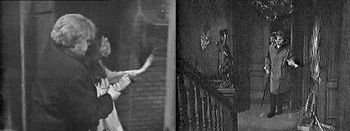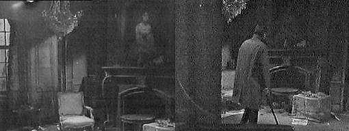 Burke continues to search, shining his flashlight on the now-dark portrait. He hears something outside and stands, aiming his rifle at the door. Joe enters, smiles, and tells him not to get trigger-happy. Did you find out anything? asks Burke. Yes, says Joe, there is a place in this house we haven't searched--and he marches over to the bookcase (heartstopper!)--the storage cellar, he says, the entrance is out back. I already looked there, says Burke, I found it. Did you get in?--Mrs. Stoddard said was locked, says Joe. I broke the lock says Burke, nothing but a lot of musty old junk--did she tell you another place Vicki might be? Matthew holds Vicki securely inside the secret room, barely inches from the two men trying to rescue her. Hope, says Joe, she knows this place better than anybody else. That's true, says Burke, what do you think we ought to do?--I suppose we ought to get out of here, we're wasting our time. The sheriff came to the house about 20 minutes ago, Joe reports, with a dozen men.