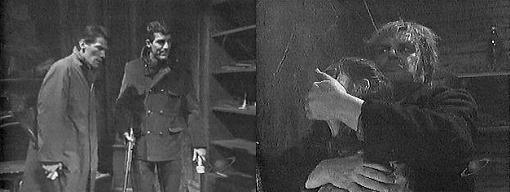 (Matthew's eyes widen.) Where are they? asks Burke. Out coming the woods, says Joe. We'd better join them, says Burke, we're not doing Vicki any good here. And, to Vicki's horror, Joe and Burke leave the house. Matthew takes his hand away from her mouth and she's able to get in one good healthy scream of, "BURKE!" before he silences her again. He listens at the door, holding her fast in his grip, but the men are gone. He shoves her down onto the mattress. "That was a dumb thing to do, Miss Winters!" he says--"real dumb!" Vicki looks up at him with terror.