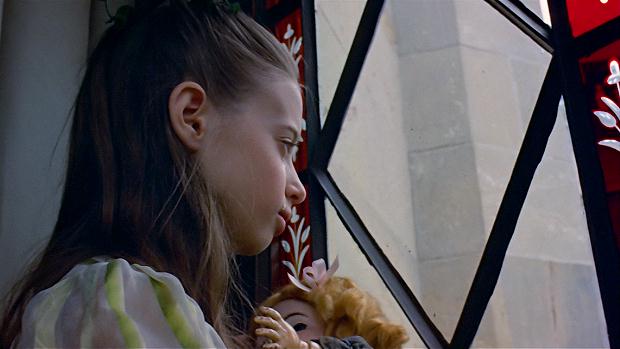 - immediately after looking down, Angelique actually looks over toward Sarah's window - and while DC also has a note that the wide angle shot and zoom in on Collinwood that he crossed out in his script would be replaced buy an Angelique's P.O.V. shot of the house without any zoom, that note is also crossed out in his script and the shot doesn't take place because what we actually see immediately after Angelique looks over is simply a shot of Sarah in her room, holding her doll -