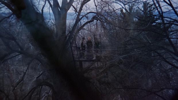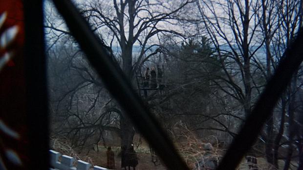 - to watch things that only happen in the 97 minute and 129 minute versions of the film (and also more on that in the future post) - and when it comes to Scene 131 (which I honestly believe should be numbered 130 - but more on that in another future post), while Angelique's body is hanging up in the tree, and while we do see the main characters exit the shot, the men do not descend the ladder to the ground because in fact the two men atop the platform remain and as the main characters move toward Collinwood, one of men moves to one of the ladders -