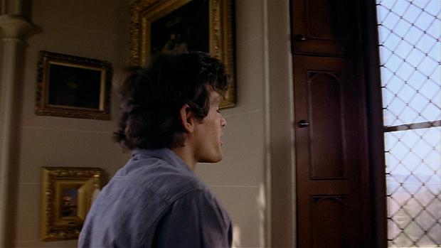 When it comes to DC, first up he has a note that the camera will pan with Quentin and lose Carlotta as Quentin gears up and delivers the line that Angelique's spirit is still alive in the house, but while the camera does indeed pan with Quentin, losing Carlotta in the process would be sort of hard to do when, as we can certainly tell from the first capture above, Carlotta isn't even in the shot - she doesn't appear in the shot until Quentin just about reaches his painting, so in reality, Carlotta is gained in the pan, not lost. And DC's second note says that Carlotta will cross into the shot after Quentin says that Angelique's spirit is still alive in the house - but, again, that would be sort of hard to do when she's already in the shot before Quentin says that. And DC's third note is that Quentin will turn back to us before he says he's not Charles - but obviously that doesn't happen either. The one note that does actually take place in the film is DC's fourth, where he says that Carlotta will cross to Quentin before she reveals that he'll realize that there's no place in the house for Tracy.