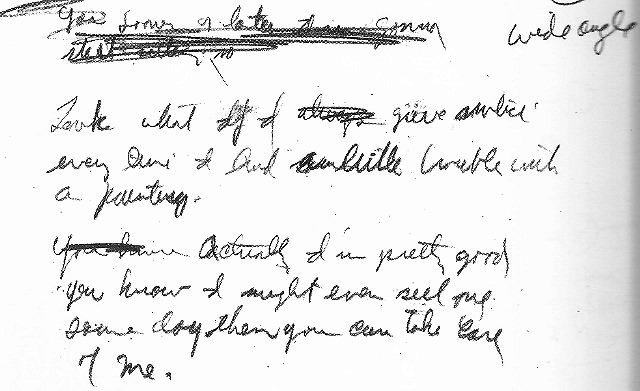 End of the main part of the scene as typed and also added to. But after the bit of typed dialogue added just above but also crossed out, there's quite a bit of handwritten dialogue. Most of it I can decipher - but parts are questionable. So once again I'm scanning a notation to present for our resident handwriting deciphering expert to see if he can make out what it all says: