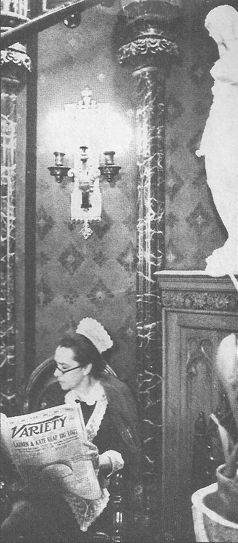 Everyone has probably seen the hoDS behind the scenes photos of Nancy Barrett studying her script while sitting on one of Lyndhurst's antique benches, Joan Bennett getting her make up applied in the makeshift make up room in Lyndhurst's kitchen area, and KLS, Roger Davis and Grayson Hall in period costume and seemingly talking over the script in another room on the same level of Lyndhurst. But what I'm about to share has to be the wackiest behind the scenes photo from that TV Star Parade article: