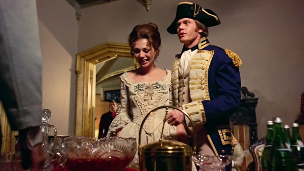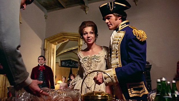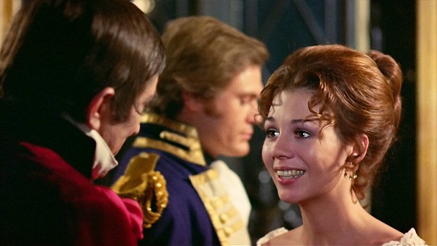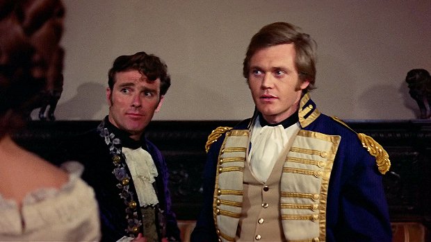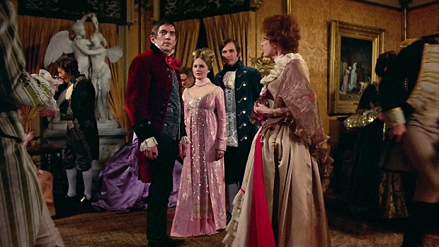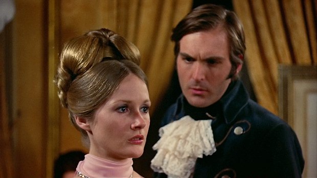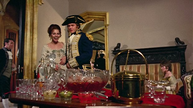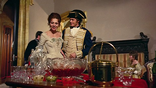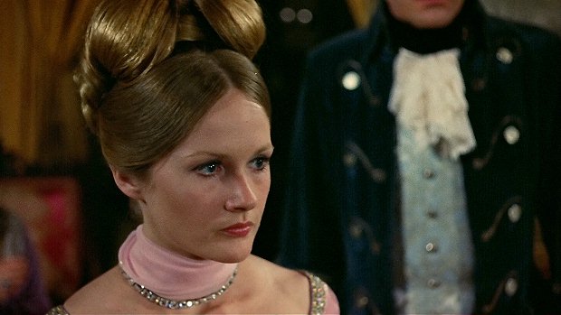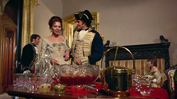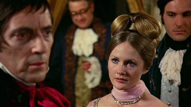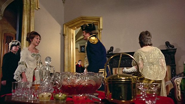 - Barnabas, Carolyn and Todd as Carolyn continues to stare at Barnabas and his gaze shifts to presumably spotting Maggie in the organ room (and speaking of that shot, the "Yes, this is her last night at" portion of Julia line is delivered over the shot of Maggie as she moves off toward the organ room, whereas the "Collinwood, isn't it" portion is delivered over the above shot) - and then, despite the fact of the portion of the script that says we would see Maggie at the bar and Jeff joining her being crossed out, something very similar does indeed appear in the film because things switch from Barnabas, Carolyn and Todd to Maggie entering the organ room, seeing Jeff in costume while another woman in the room watches them, and then Maggie blurts out an unscripted -