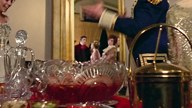 and then things actually do go back to Barnabas, Carolyn and Todd in the drawing room as Barnabas turns to Carolyn and offers to get her a drink, though rather than champagne, he actually offers "Let me get you some punch, Carolyn" - and after he moves off is when we actually see Carolyn looking quite none too pleased as she -