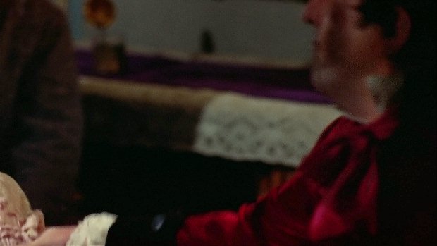 This sequence is quite interesting to me. Though Carolyn is certainly in his thrall, she is nowhere near as passive and submissive as most of his other victims. The TV vampires seem to be much more in control of their prey than the HODS Barnabas.