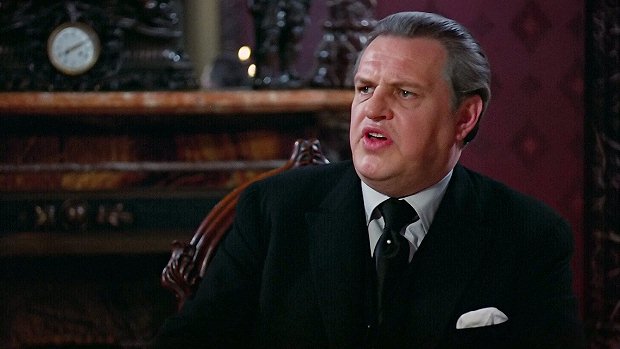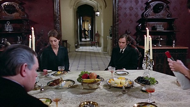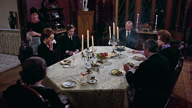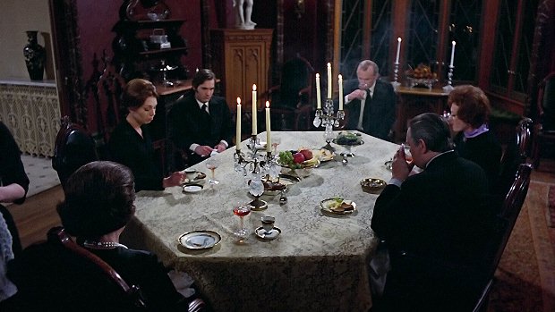 And when it comes to the dialogue, the descriptions, the directions, and the notations, again some things are quite different from how things actually play in the film. As we saw yesterday, it's Mrs. Johnson and not Roger who's pouring the wine, so he actually jumps up from his chair to deliver today's quote exactly as scripted, though there is no close-up of Roger or Liz as DC's notations indicate - and speaking of today's quote, I love the look Julia gives Stokes while Roger is delivering it -