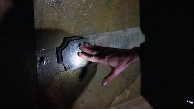 - the vault where he proceeds to walk over toward Carolyn nameplate on the wall and -