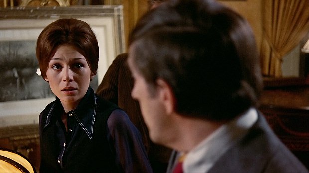 Grayson walking into the room with hands clasped and reaching for her purse--another brief moment when we're again in the world of DARK SHADOWS.