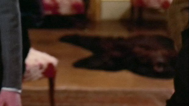 I realize I might be the only one who was unaware of this until today while I was picking out captures for posts, but I honestly never noticed until today that there's a bear rug on the floor of the drawing room. It's briefly seen twice. The first is when Julia enters the drawing room: