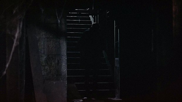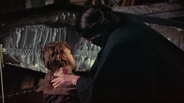 Willie lies on the floor in the extreme F.G. as Barnabas runs and kneels beside him. Willie stirs, there is blood running from his neck, he opens his eyes and looks up at Barnabas.