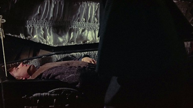 And when it comes to the dialogue, the descriptions, and the directions, things play a bit more interestingly in the film. From Barnabas shocked reaction at the end of Scene 143, the camera whips pans to begin Scene 144 with a shot of Carolyn's coffin with -