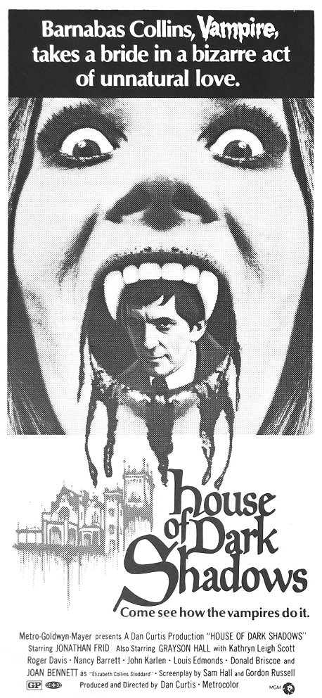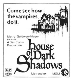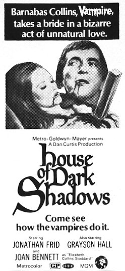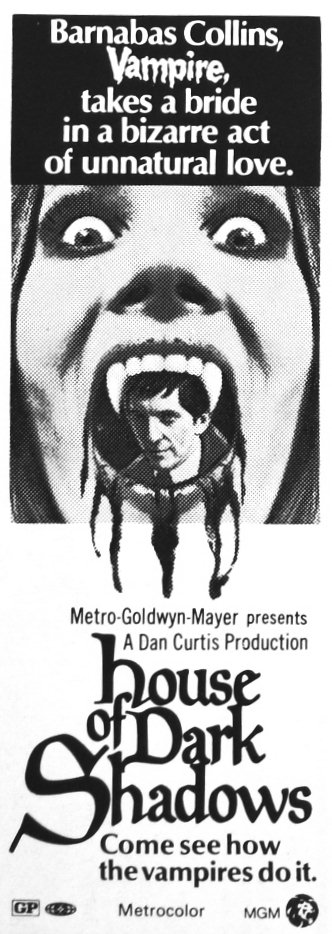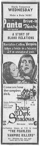 My memory of the very first newspaper ad I ever saw for hoDS is pretty dramatic.  What I recall is that we were on a holiday trip to Florida and somewhere along the way, one of my parents picked up a paper.  I was looking through it and there was this tiny ad for the movie.  It just showed the faces of Barnabas and Carolyn running with blood.  (I think the Barnabas shot was from his second attack on Maggie, and the Carolyn shot was from the post-staking set-up.)  Maybe it's a false memory but I just remember bouncing up and down with excitement, no doubt while my mother rolled her eyes--she hated DS.