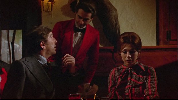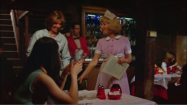 And when it comes to the dialogue, the direction, the descriptions and the notations, it's interesting that whoever typed the page made that error placing this scene outside, well, unless they thought the Collinsport Inn has an alfresco dining room - and the scene doesn't begin with Barnabas and Maggie sitting at a table because first we see what seems to be a standing patron and waitress (I wonder if she's secretly named Susie? [b003]) chatting with a seated patron while a waiter (or perhaps wine steward) begins to go by -