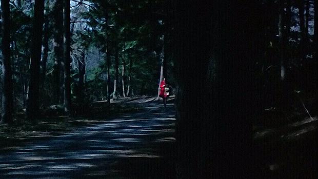The bushes RUSTLE.  She suddenly is afraid.  She runs