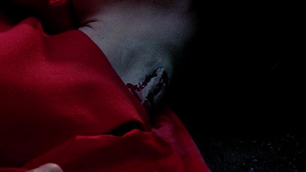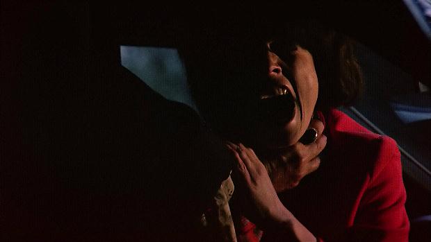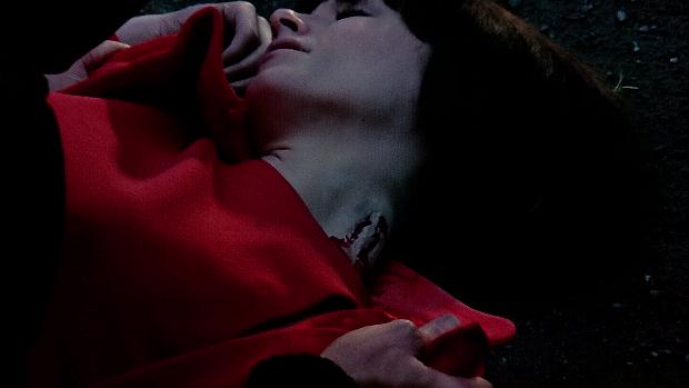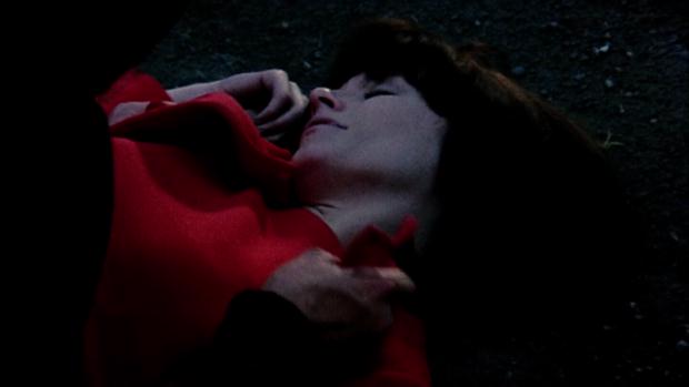 And when it comes to the differences in the directions and descriptions laid out above, obviously Daphne doesn't run from Jeff because as we pointed out yesterday, she has already collapsed on the ground - and since she's already on the ground, we don't see her trip and fall - and as she lies on the ground, we don't actually hear her sobbing because she seems to have passed out - and given that he'd already called out her name, Jeff had already recognized her before he got out of his car - and while the camera does indeed go into a tight shot of Daphne's face and neck, DC has a note that the camera would zoom in on the holes in her throat (Dick Smith's fantastic makeup) -