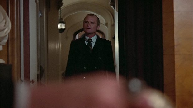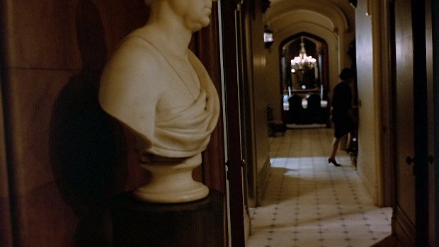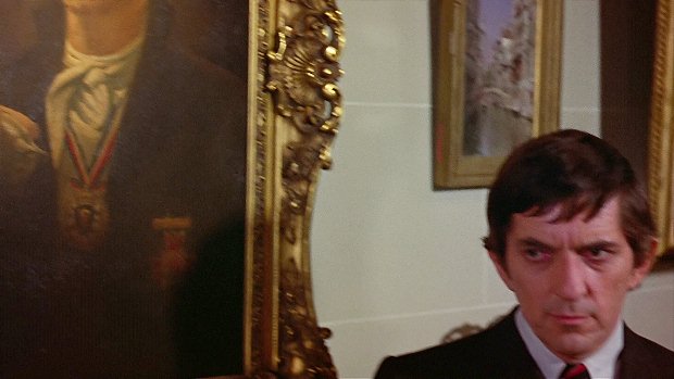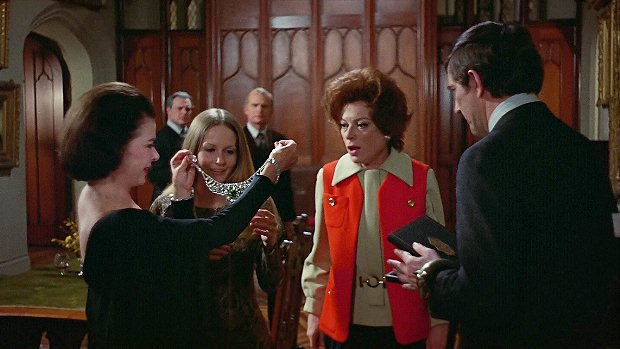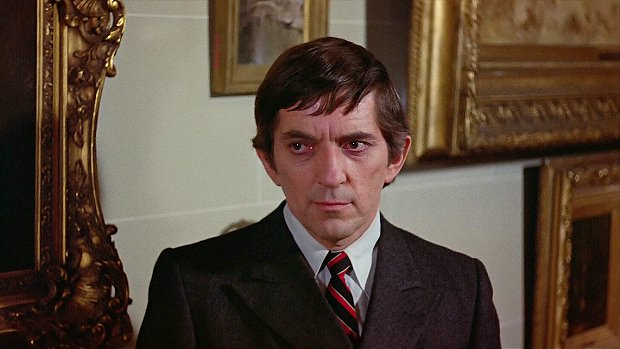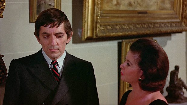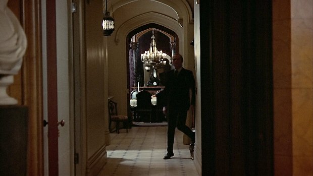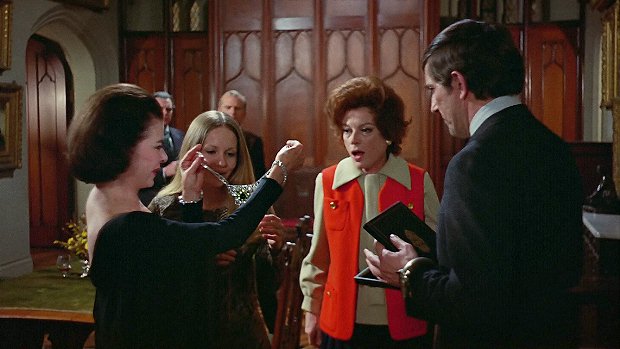 However, when it comes to the dialogue, the directions and the descriptions, things don't quite play like that in the film. Barnabas does indeed cross to the portrait and ask if it's Naomi - but then in an unscripted move Liz crosses over to him as she answers exactly as scripted - though as we've seen all along, Barnabas has been holding a box -