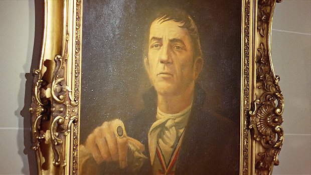 She holds up the necklace. It is the same one that Naomi wears in the portrait.