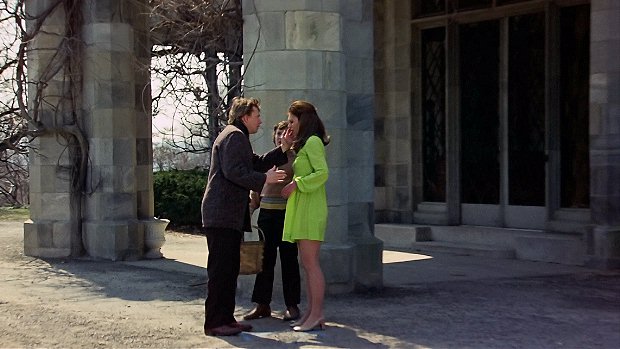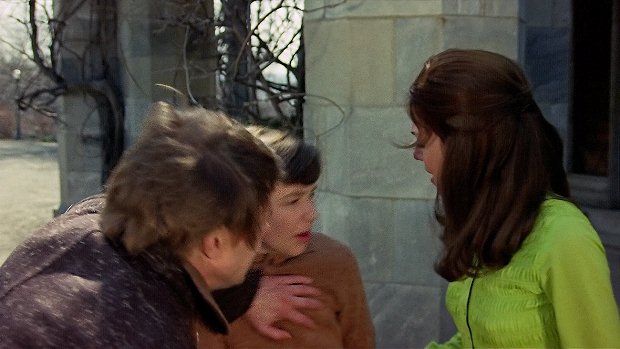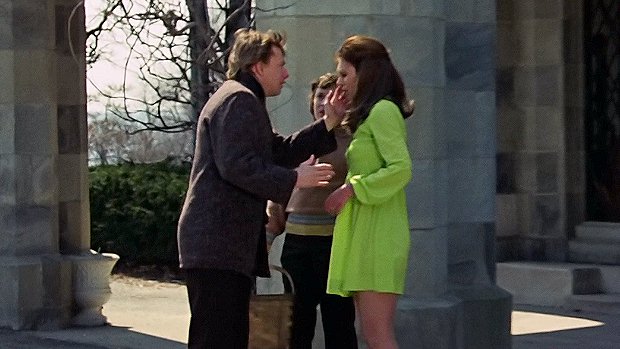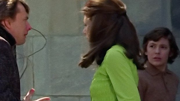 What Maggie turns to David and actually says is "David, take those things inside, would you?" (apparently, even though it doesn't explain as such, the script envisioned that Maggie would be holding the picnic things and hand them off to David, but as can be seen in the captures in the previous post, it's David who's carrying them) - and after David replies with an unscripted -
