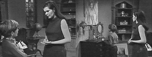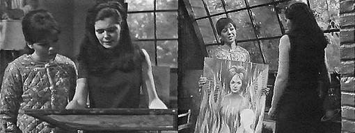My dream! Cries David--it's my dream! Where did you get this? asks Laura, disgusted. From Sam Evans, says Vicki. Laura walks away. It's horrible, she proclaims. David takes the canvas in his hands and gazes at it. How did Mr. Evans know about my dream? He wonders. He didn't, says Vicki--it's just something he painted. When did he do it? asks Laura. He said he started it the day you came back to Collinsport, says Vicki. How did he know about it? asks David, did he have the same dream? He doesn't know why he painted it, says Vicki. I don't understand, says David, how a man could make a painting out of what I dreamed. You had a dream like that? asks Laura. Yes, it was the night you came here, says David. Holding onto herself as if cold, Laura wonders what made him put her face into that picture. He doesn't know, says Vicki--he's practically incoherent when he talks about it. That's understandable, says Laura. Look at all the colors, says David admiringly. I wish you wouldn't look at it! says Laura. It's OK, it doesn't scare me, says David. Why do you have this? asks Laura, agitated. He gave it to me, says Vicki. Why? asks Laura. Because he was going to throw it away, says Vicki. Why didn't you let him? demands Laura. I don't know, says Vicki, it seemed a waste. A shocking painting! says Laura--what do you intend to do with it? I don't know, says Vicki. Could I have it? asks David. David! chastises Laura. I don't have a real painting in my room, he says. This is not the kind of painting you want to have in your room! she says. How about it? David asks Vicki--can I have it? I don't think your mother wants you to have it, says Vicki. Mother, please? begs David. It isn't good, she says. I like it! he says. I'll get you a better one, she says. Why can't I have this one? he says, I want this one!--it's a picture of you! But it's not a good one, she insists. It's a special picture, says David, of my dream, and of you!--it means something to me--I don't have a painting of you! I'll get you another one! she says. But I want this one, he says. I want you to have what you want, she says, but this is not a good thing to have. Why not? he asks. Because of what it represents, says Laura. You're mother is right, says Vicki--it's not worth hanging anyway--it's not even finished. What's supposed to go there? asks David. Mr. Evans didn't know, says Vicki. (Looks like David's profile to me.) What do you suppose goes in that spot? Asks David. Laura says she doesn't know. Please can't I have it?--I want it more than anything else! he pleads--Miss Winters?--please? It's not up to me, it's up to your mother, says Vicki. Mother, wheedles David. All right, agrees Laura, reluctantly. Oh, Mother!--Miss Winters!--thanks a million! He says, thrilled--I'll go hang it up in my room. It doesn't have a frame, says Vicki. It doesn't need a frame, says David, I can put a string across the back, then I'll hang it up--would you come up and help me? All right, says Vicki. Hurry! says David, and runs upstairs with his treasure. I'm very upset about this painting, Laura tells Vicki. I can see that, says Vicki. You never should have brought it into the house, insists Laura. I suppose you're right, I should have known it would have a bad effect on David, says Vicki--I don't know why I brought it here--I seem to have been compelled, as though I had no choice in the matter--as though it were prearranged. That's a very strange thing, says Laura--I want you to promise me something--if the opportunity presents itself, I want you to get the painting away from David! Vicki stares at her.