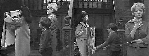 Vicki comes up to David's room, where he is on his bed, putting a string on the back of the painting. You're just in time, he says, I finished. Vicki sits on his bed with him and suggests that before he hang it, he think about it. No, sir, he says, my mother said OK, and I'm going to hang it up. She said OK because she knew how much you wanted it, says Vicki, but it's not making her happy. I don't see why she doesn't like it, complains David, it's a beautiful painting, and looks just like her. She doesn't want you to think of her looking like this! protests Vicki. Why not? he asks, it's a good painting. It's time you started thinking of how to make your mother happy, says Vicki. Oh, he says, how about over here (above his dresser)--he stand on a hassock. You're not listening to me! accuses Vicki. This will look good, he says, hanging it on a nail already in the wall. I suppose it's as good as any, says Vicki, upset--I never should have brought that picture here. There, says David, stepping away to admire it--that's a good spot--I can see it from all around the room. Vicki turns and looks. David straightens it, and asks how it looks. Strange, says Vicki. that's the reason I like it so much, he says, it's different. Somehow, says Vicki, I think it looks like it belongs in this room. You can see it from over here very well, says David--I can sit and watch it, all day long. Laura comes in. I've hung it up, he says, taking her by the hand--doesn't it look cool? Oh, David, she says, I've given it some thought and decided what must be done--mothers aren't always the wonderful creatures children would like them to be--and I'm going to do something you're not going to like. She reaches for the painting. Don't take my painting! cries David, grabbing her arm. David! she says. Don't take it, he begs. But it's very bad for you! she says. "If you take it," he warns, "then I won't talk to you--ever!" You don't understand! she says. I mean it, he says. Very well, if that's the way you feel, she says--there are some things you're just going to have to learn for yourself. She leaves his room. I'm sorry, Mother! he calls after her--I'm sorry, but I've just got...! Laura is gone. She's mad at me, David tells Vicki. I'd be mad at you, too, says Vicki--she only wants the right things for you. I don't see why she doesn't like the paining, laments David. Because she knows it's a strange painting, says Vicki--and that you shouldn't have it.