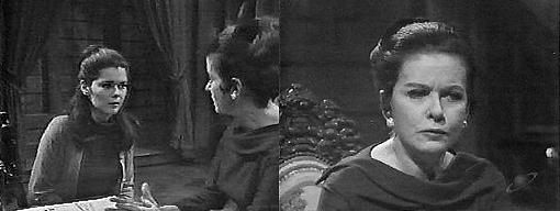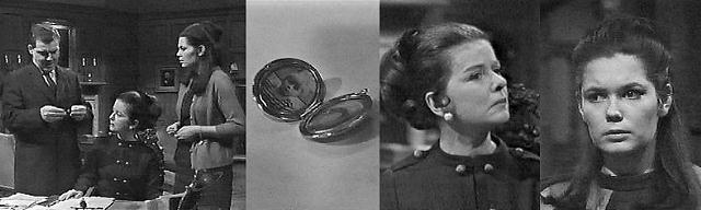 Vicki and David return to Collinwood. Liz calls them. Mrs. Johnson has been looking for David, says Liz--your lunch is ready, she tells her nephew. I'm not hungry, says David. You never are, at mealtime, teases Liz. Do I have to eat lunch today? He ask . Of course, says Liz, and David reluctantly goes to the kitchen. I'm afraid I let him spoil his appetite, says Vicki. He doesn't need any prompting for that, says Liz. We went to Sam Evans' house, explains Vicki, and I let him have some cookies. Why did you go to Sam Evans' house? asks Liz. He wanted to thank him for the painting, says Vicki. I think it was a mistake to take him here, says Liz, but before she can explain why, there's a knock at the door, and Liz goes to answer. A man holds up an ID badge and says he's Lt. Riley, detective for the State Police--I understand a Mrs. Laura Collins is living here. Yes, says Liz. May I see her? the man asks. I suppose so, says Liz, won't you come in. The man thanks her and does so. May I ask what it's about? asks Liz. I'd like to asks her a few questions about a recent death by fire in Phoenix, the man says, holding his hat in his hands. I heard about that, says Liz, have they identified the dead woman? Not yet, says the man, that's why I have to ask Mrs. Collins a few questions. I see, says Liz--Mrs. Collins lives in our cottage, I'll take you there, I'm Mrs., Stoddard, Mrs. Collins' sister in law Then you might be able to identify some of her personal effects, he suggests--some of her belongings were salvaged from the ruins of her apartment--the Phoenix police shipped them on to us--maybe you'd like to take a look at them, see if you can identify anything connected with Mrs. Collins? I'd be glad to, says Liz, if you think I can help. I think you just might, he says. They go into the drawing room, where Vicki waits. Liz introduces them. This will only take a moment, the cop says--there isn't very much, just some small jewelry, that's all the firemen were able to salvage--everything else was destroyed in the fire. He empties the jewelry out of an envelope onto the desk. I might not be able to help you, warns Liz. Take a look anyway, he suggests. She sits at the desk and discards three piece, but says she can identify the fourth--it's a family heirloom, she says, I'd recognize it anywhere, my brother gave it to Mrs. Collins when they were married. Vicki asks to see it, and Liz hands it over. Vicki examines it. That's very strange, she says, Mrs. Collins was wearing one exactly like this the other day, there must be two. That's impossible, says Liz, that locket's been in our family for generations, to my knowledge, there's never been one like it. But there must be, insists Vicki--I remember this distinctly, because she told me a story about it--she told me she had a lock of David's baby hair in it--she always kept it with her. Yes, says Liz, she clipped a lock of David's hair after he was born and put it in that locket--but I'm sure it can't be the one you saw. But it must be, says Vicki--she told me about the hair in it. Let me see if I can open this one up, suggests the cop--he has trouble, but manages to get it open