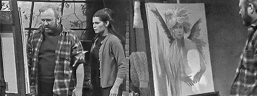 What do you mean? asks Sam. I want it, says Vicki. How can you want this painting? asks Sam. I don't know, admits Vicki, there's something about it. That's why I'm throwing it away, says Sam--there's something about it. Rather than throw it away, says Vicki, let me buy it from you. I can't sell you a painting like this, protests Sam. You can't be serious, says Maggie, I am, says Vicki. I'd like to have it. And I'd like you to tell me exactly what's here that appeals to you, demands Sam. I don't know, she says, but something does. Look at it, he demands, tell me why you want it! It's just something I feel, says Vicki. It's an evil, horrible painting, says Sam, setting it down on a chair--I've never painted subject matter like that in my life, nor will I ever. I'd just as soon he did get rid of it, Maggie tells Vicki--he won't be the same until it's out of here. If you're going to get rid of it anyway... says Vicki. You want it that badly? he asks her. Yes, she insists. Fine, he says, handing it to you--it's yours, a gift from me to you--but not with sincere compliments. Thank you, she says. Don't thank me for that kind of thing, he says. There's an area here you've left unpainted, points out Vicki. I know, says Sam. What were you going to put there? I don't know, says Sam, cleaning brushes. You must have had something in mind to leave a space like that open, insists Maggie. I tell you, says Sam angrily, I don't know why, I've been staring at it and I don't know what goes in there. I was just curious, says Vicki. If you look at it as long as I have, warns Sam, you'll cease to be curious--I want to tell you something--when you've looked at this long enough, don't bring it back here. I won't, promises Vicki. I want you to destroy it, he says. I'd never do that, Vicki says. Throw it in the sea, says Sam, cut it up or burn it--yeah, that's what you should do--that's what has to be done to it--it should be burned!--if you destroy it, which I'm sure you will, I want you to come back and tell me after you've done it--AFTER you've done it, and don't worry, you won't hurt my feelings. Take it easy, Maggie urges her father, the painting won't be here anymore--you can get on with some other work. I feel better already, says Sam--I think I'll go down to the Blue Whale and get a little brain-washing. (interesting term for getting drunk.)--get some inspiration for a new canvas. If it makes you feel better, says Maggie in a small voice. It rejuvenates me, says Sam--goodbye, Vicki, and good luck with your acquisition. Thank you again, she says. Don't thank me, he advises, putting on his hat, I wish I could suggest a frame for it, but I can't think of any frame that would be right for it. He leaves. Maggie, really upset, watches him from the window. I'd like to apologize for the things my father said, Maggie tells Vicki. You don't have to, Vicki assures her. He's been acting that way ever since he saw Laura Collins, says Maggie. He hates this painting, says Vicki, I don't understand. What I don't understand, says Maggie, is why you wanted it in the first place. I can't explain the way I feel, says Vicki. Do you really like it? asks Maggie. It's not a question of liking it, says Vicki, I just think this is a very important painting. Come on, says Maggie, my father is a very good painter, but he doesn't turn out masterpieces. What I mean is that there is some kind of meaning behind it, explains Vicki, some kind of fascination about it--that intrigues me--it's almost as though--no, that's absurd--it's almost as though this painting was the real reason I came here today. You'd never seen it before, or heard of it, says Maggie. I know, says Vicki--there are so many things I don't understand. I have an idea you could explain it better than I could, says Maggie--I am going to wrap this for you