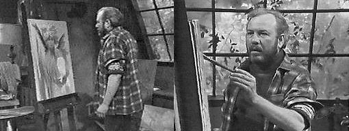 Evans cottage - Maggie checks her watch and turns out lights. She looks out the window for her father. Sam, drunk, comes in. "Let the lower lights be gleaming!" he sings. "Send the beam across the bay--or is it let the lower lights be beaming, send the gleam across the bay." Maggie chuckles, noting that whichever it is, he seems to be doing both. He laughs and hugs her, saying he feels good--can't blame a man for that, can you? There's such a thing as feeling too good, she says, but he says he can't tell her how great it feels, getting rid of that canvas. You get some rest, she orders--you're going to feel terrible in the morning. My mind's too busy to rest, says Sam, slipping off his coat--I've bee thinking all night about a seascape--there's an old, battered hulk on the beach, half in the water, half out. Sounds fine! Says Maggie. I've been thinking about the composition, says Sam, settling a canvas on the easel--get a few lines on here before the night's out. I wish you wouldn't, she says. You go to bed, he encourages, I'll be all right. OK, she says, and goes into her room. Sam whistles as he draws, getting into his work. Suddenly, he stops, his face sickened. He backs away from the canvas.