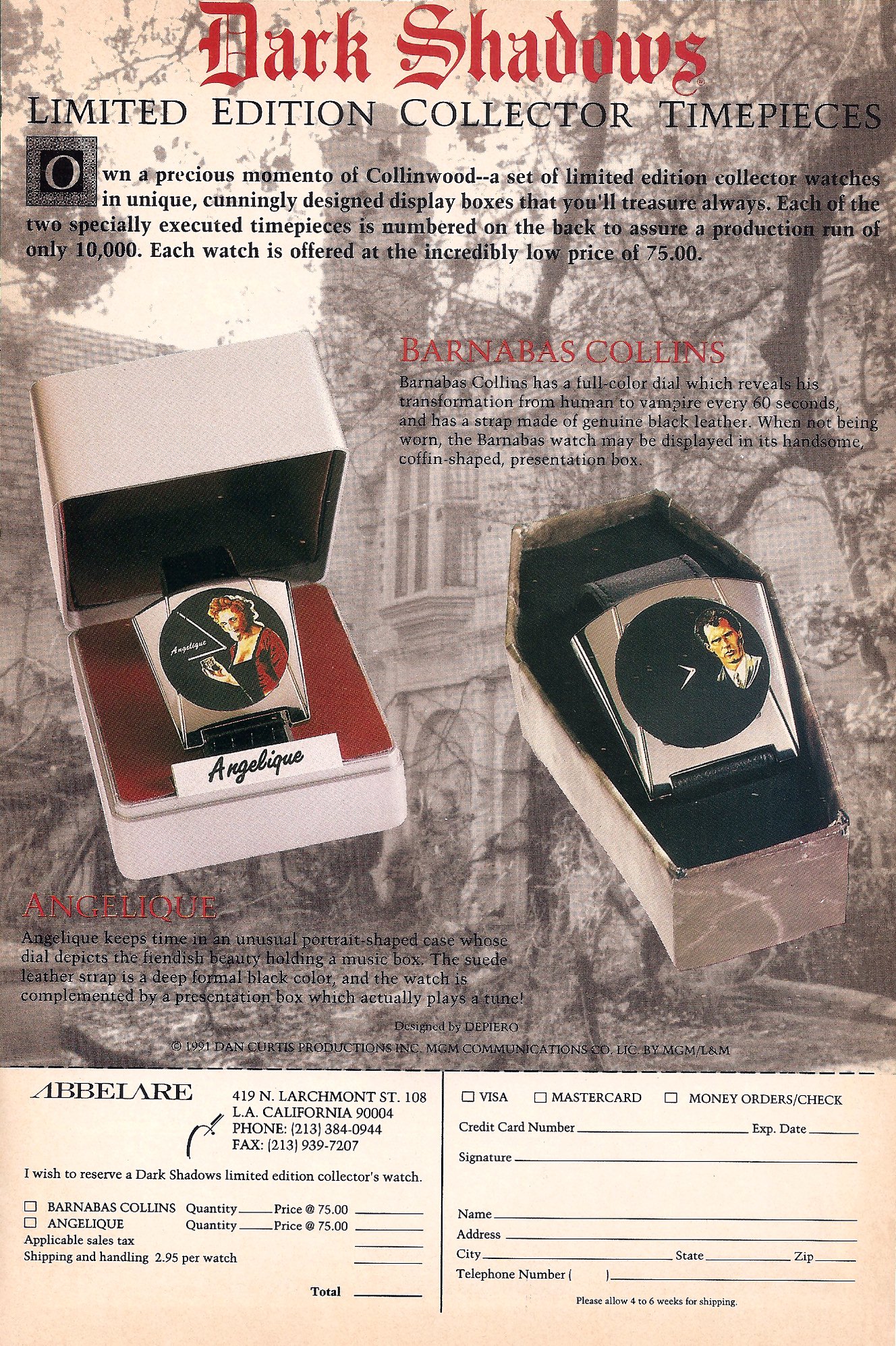 I didn't buy the watches myself. I thought that they were kind of pricey (and I thoroughly dislike the theme from Love Story). My friend bought them and probably still has them. There was a cute gimmick that one of the hands swept by, Barnabas "transformed" into a vampire. I think the eyes changed color and fangs appeared. Not entirely sure, as it's probably been 20 years since she showed them to me.
