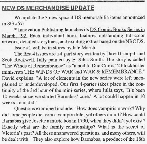 The second is that the series wouldn't have to depict Collinsport during the winter if they placed 10 weeks of Barnabas' cure in the late fall and winter and decided to skip over those 10 weeks by merely referring to their passage during one of Julia's voiceovers. And one would think, given the fact that they chose to set their comics during those 10 skipped weeks of Barnabas' cure, when the creators of the comic researched the time frame of those 10 weeks, they would have realized that they took place in the late fall and the winter, and thus during the time when the transition from 1990 to 1991 took place. But apparently not... But then, as we'll see, that was hardly the only instance where they didn't think things completely through...