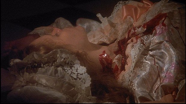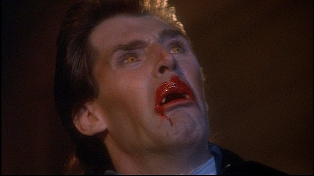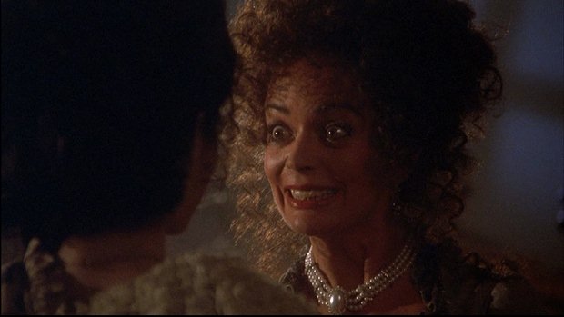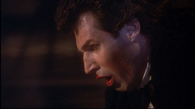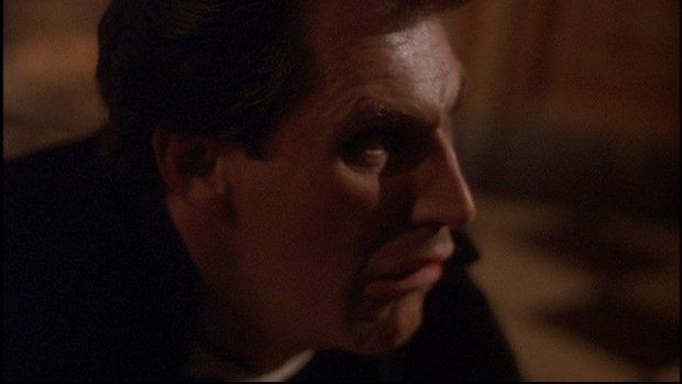 When it comes to the scene that Barnabas recalls in his dream, it's just a bit different in Ep #10 of the '91 Series. It actually begins with Millicent coming down the stairs in the foyer while carrying hat boxes. After she reaches the first floor and puts them down on the floor, she hears a door unlatch. She calls out to Ben, but when she turns toward the door at the far end of the corridor, all she sees is a figure silhouetted against the light coming in the door. She calls out to Ben again, but as the figure moves closer, she soon has the shocking realization that it's Barnabas, who was buried that day. She says his name in shock and screams in terror when Barnabas bares his fangs and moves in to attack her. Though during the attack she actually moans in what could be considered pleasure as Barnabas takes her to the floor.