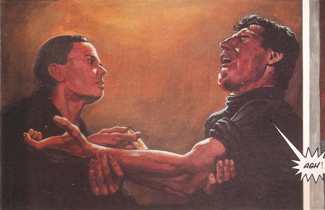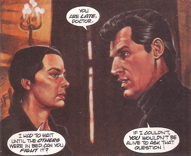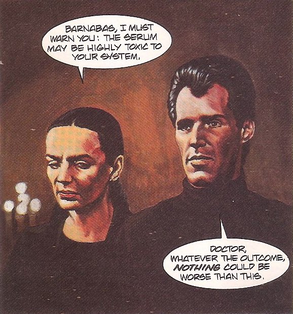 So, as we can see from the scene, Barnabas doesn't react anything like how he does in the comic as Julia administers the injection. In fact, the comic's panel is composed very similarly to this still (which is one of a set of stills) -