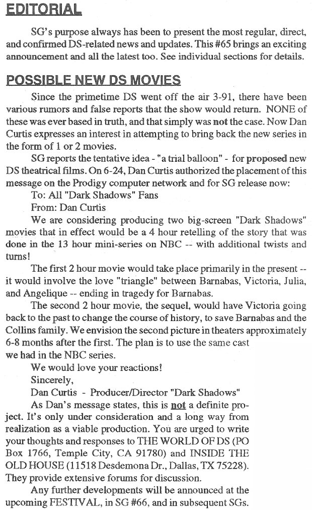 When I heard about the proposed movies my first thought after finding out that DC had co-written the script was "Oh, great - yet another retelling of hoDS!" But then it came out that someone else (I prefer not to say who quite yet) was also involved and bringing a fresh take to things. As more details came out, some might even say that the movies seemed like they may have had even a radical take on things. And if one reads the announcement carefully that might have already been able to be gleaned as the first film would have ended in "tragedy for Barnabas," as in a possible death? And with the second film it appeared as if Vicki would somehow deliberately go into the past to change the course of history to save Barnabas, possibly meaning she had somehow learned he was a vampire and had been cursed in the past? If that actually was to take place, can you imagine an ending to the second film along the lines in the present of an actual Barnabas descendant arriving at Collinwood as a real long-lost cousin from England and not as a vampire using that cover? But who knows? Only the first script was ever written, and so far as I'm aware even that one has never surfaced publicly...