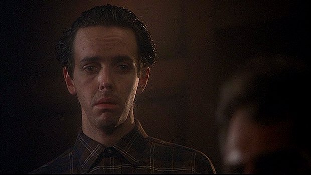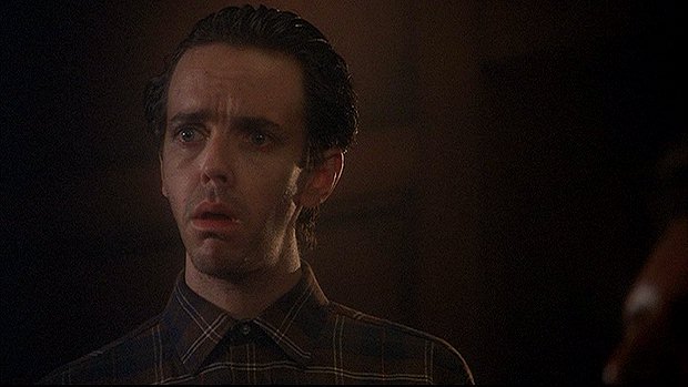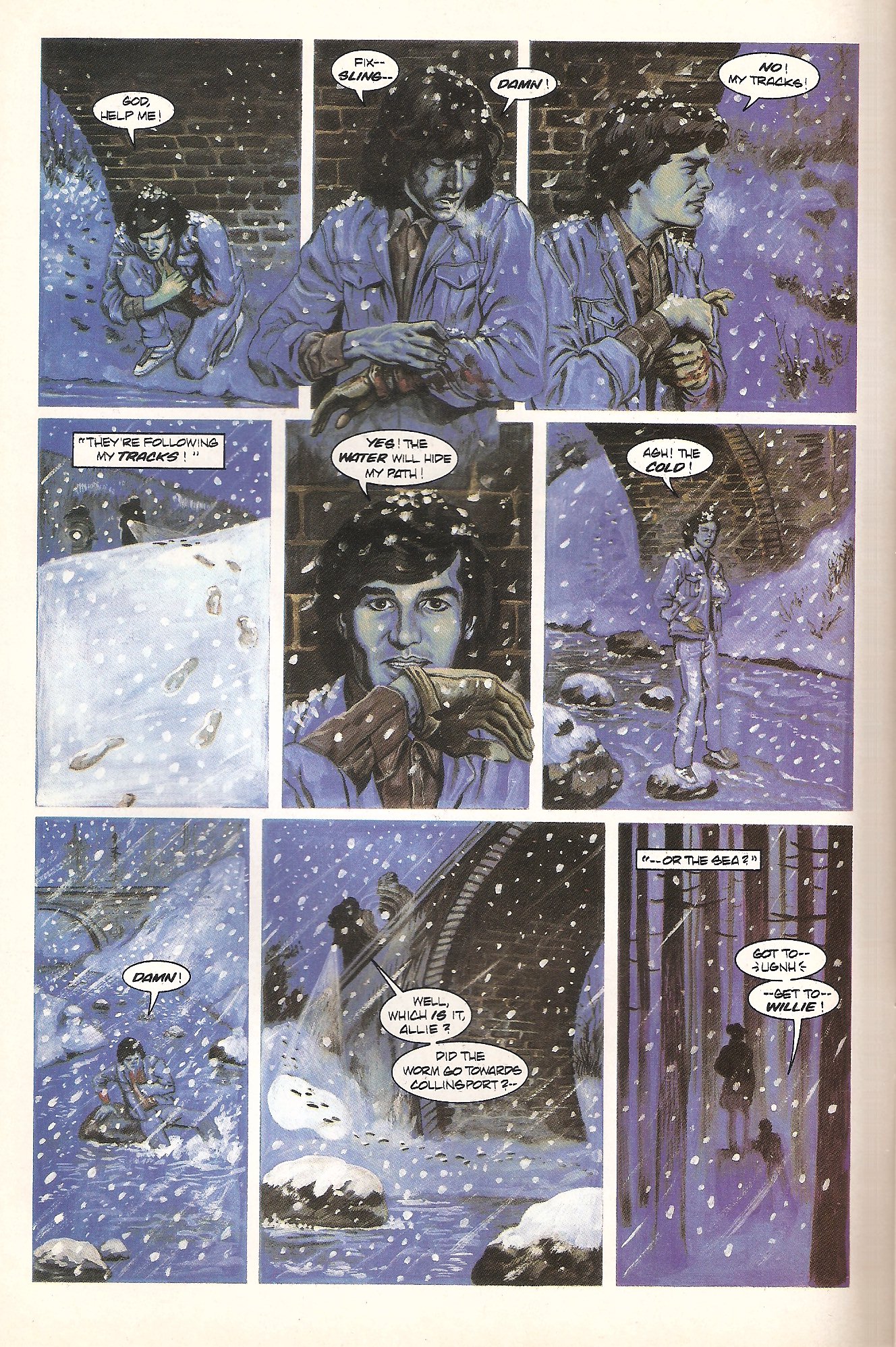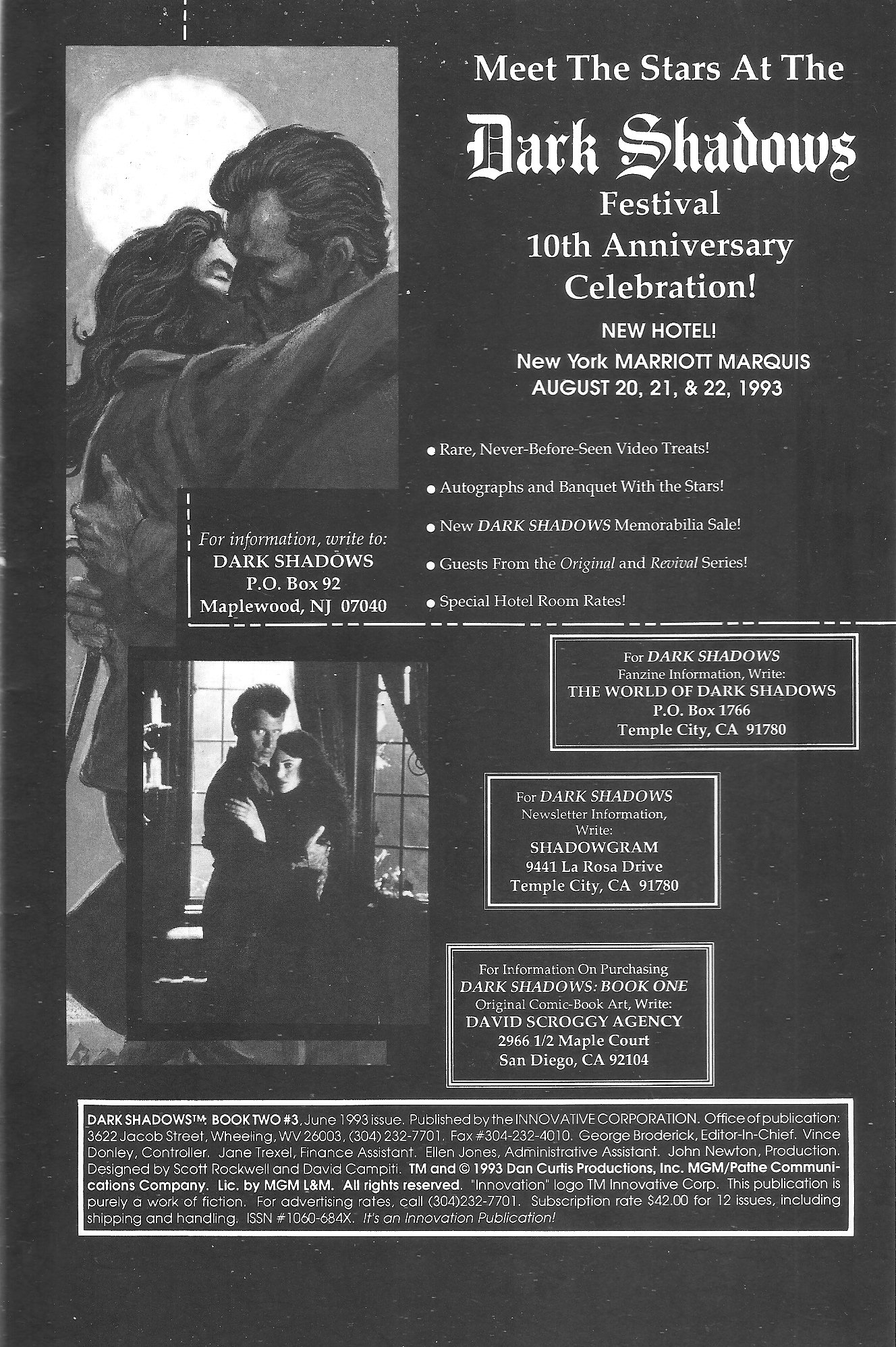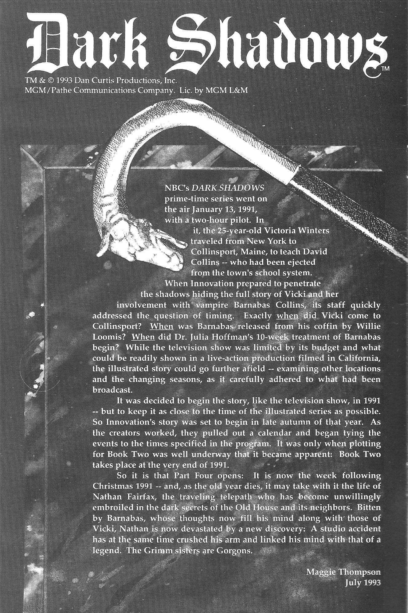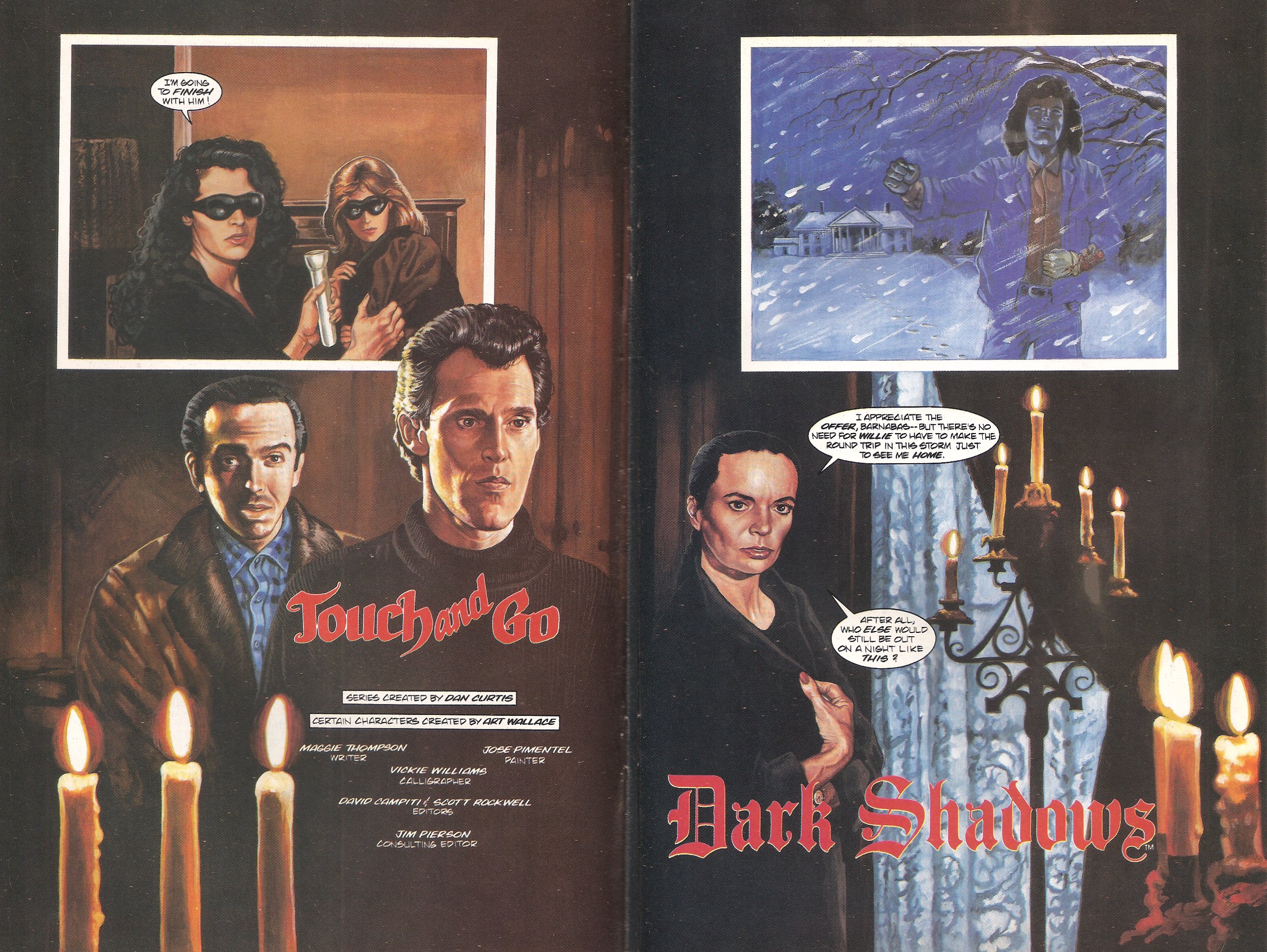 (And once again I apologize for taking captures from the DVD set with its incorrect color timing and aspect ratio rather than the VHS with its correct color timing and aspect ratio. But it's such a hassle to set up a VCR for captures - and even though I've made digital copies of the tapes, and even though I've looked for those copies in tons of places, I'm still not quite sure where I've stored them...)So, we can easily see that the comic barely touches on how the sequence actually plays in Hour 4 (Ep 3) of the '91 Series. And worst of all, the comic not only completely ignores the huge amount of stress Barnabas is under waiting for the injection but also his violent reaction to the serum. But given how all that actually happens on the show, I have no idea what to think of the Book 2, Issue 4's depiction on Pages 2 and 3 of Willie (who the comic completely ignored was even present for the injection and its aftermath), Barnabas and Julia simply standing around with Julia declining having Willie walk her home. On the show Barnabas can barely speak after the injection. And considering events related to the injection play concurrently in Issues 3 & 4 with the events involving Nathan and the Grimm sisters, it's obvious that it can't be that there's a possibly that more time passed in the comic between Barnabas' injection and his offer that Willie take Julia home. But obviously we're supposed to forget all about how things play out on the show in favor of accepting Issue 4's grossly simplified take on how the injection goes down much more smoothly. Again, so much for the comics keeping exactly within the continuity of the actual show. Adding the snowstorm is but a minor departure by comparison...