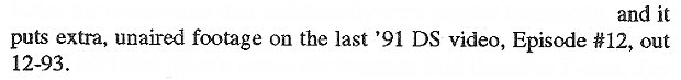 Oops!  [santa_embarassed]  I'd completely forgotten that in the "New DS:" section in the Home Video update from SG #65 that I'd shared in reply #187 it says, "An extra highlight is Episode #12, the last show, due 12-93. It includes more scenes filmed but not broadcast." Oddly, I made no mention of that detail when I posted it, though I must have read it. I guess it just went right out of my mind after I did. Though I did post a few different things in this topic that day, so maybe part of my mind was focused more on what still had to posted rather than what was being posted. And in my defense, it is but 2 sentences in a much larger update...