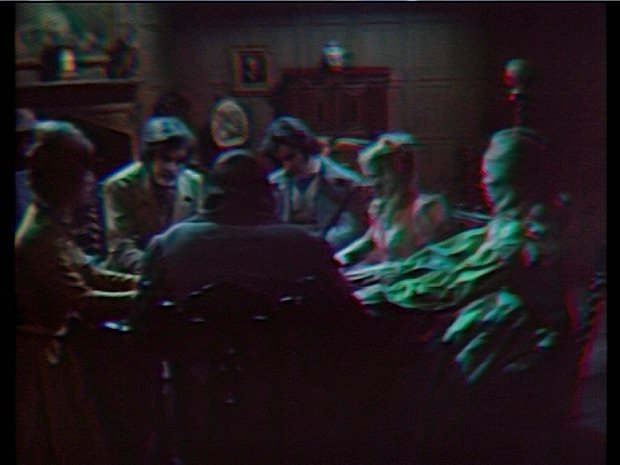 With the unconscious Morgan seated in one of the chairs at the table, the seance commences. Quentin again assures Carrie and Ben, Carrie will be safe, even if the drug wears off. I've already told you the history of the man who has possessed Morgan, Quentin reminds Carrie--I want you to contact the spirit of James Forsythe. Scared, Carrie says, I'm ready. Hopefully, we will be able to rid Morgan of his possession if we succeed, says Quentin. The lights are put out; everyone (all six of them) sits at the table and joins hands. Maintain contact throughout, says Quentin--concentrate very deeply. Carrie calls to James Forsythe--who once lived and died here--if you can hear us, give us a sign...we are waiting to hear from you--can you please speak to us? The chandelier tinkles. A figure appears outside the window. Morgan stirs and speaks. "What is it you want of me? I am James Forsythe." Why are you speaking through Morgan? asks Carrie. I speak through Morgan because I must--I am only a spirit without form or substance--I possessed Morgan to be free again and right all the wrongs that were done to me. Who wronged you? demands Carrie--tell us, please.He is here now....he has come to get me again!" cries Morgan--"BRUTUS! Brutus is in this room!--Brutus has come to get me, to send me back--you will not get me!"