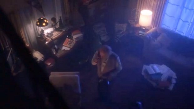 downstairs, calling to his cat.  Barnabas, from behind, grabs his