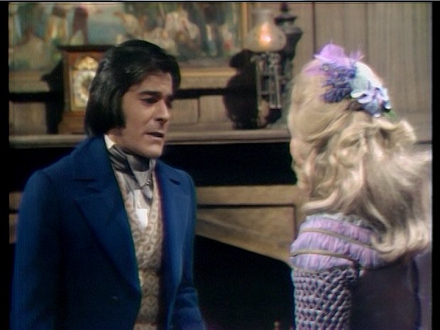 Joe comes to Collinwood, bearing papers from the cannery. Carolyn tells him Frank and Dr. Guthrie have gone for a walk around the grounds, but should be back very soon. I guess I can find them, says Joe. I don't think so, she says--you might be walking in opposite direction and never even know it. Did they say where they were going? queries Joe. No, she says, but you can wait for them here. I'd leave the papers here for him to sign except that I'm supposed to get them back to the office as soon as I can, says Joe. Then you might as well wait in the drawing room where you'll be comfortable, she suggests, and he enters the house and follows Carolyn into the drawing room. She tosses the papers on the desk and asks how he's been. OK, he says, you? Not so hot, she says. I can imagine, he says, how's your mother? Improved--but not very much, she says. I'm sorry to hear it, he says,. They still won't let me see her, says Carolyn. That must be kind of rough on you, he says. I'm used to feeling kind of bad, says Carolyn, but always before, my mother was here, I always had someone I could turn to.