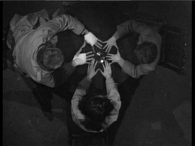 We have to sit very quietly, she says--put your hands flat on the table--we have to make an unbroken circle of our fingers. Sam does so, David hesitates. What's going to happen next? asks David. If we're lucky, she says, Josette will speak to us, says Vicki. Speak to us? he asks. I hope so, she says, try not to be afraid. I won't be afraid, he says, and adds his hands to theirs. This circle must remain unbroken no matter what, she instructs--clear your minds of everything but Josette--concentrate on Josette Collins--we have to repeat, over and over and over again in our minds, Josette Collins...Josette Collins...Josette Collins. It won't work, insists Sam, not without Dr. Guthrie. Please concentrate! implores Vicki. They do. Josette, says Vicki, we're calling you, Josette, come to us, Josette, come to us, Josette. David begins to moan. David! cries Sam. Leave him alone! orders Vicki--concentrate on Josette. Come to us! calls Vicki, as David continues to moan.